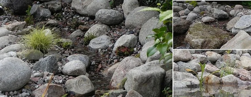 Hier werden der Wasserfall sowie der anschließende Bachlauf durch das Pumpenfiltersystem des Teiches mit Wasser versorgt.