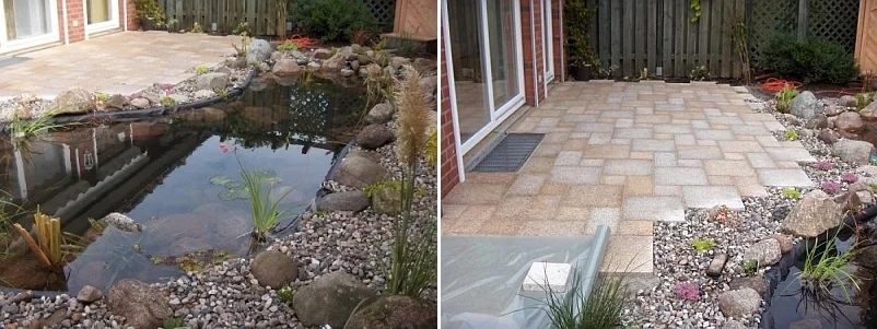 Hier zeigen wir Ihnen die Möglichkeiten auf, wie eine komplett neue Gartenanlage samt Teich, Terrasse sowie Zuwegung auf einem Grundstück von knapp 150m² zu realisieren sind.